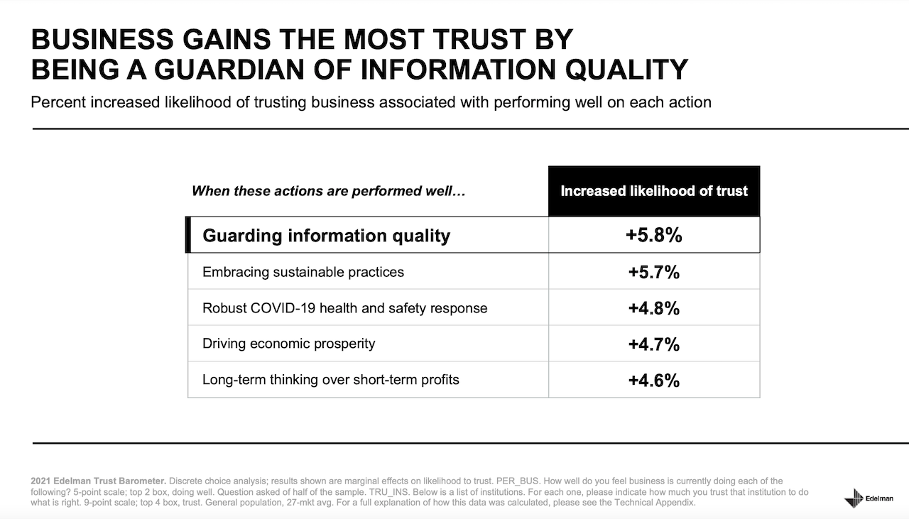 Here's a slide that everyone selling – whether it's new homes, new communities, or any part of the real estate and construction building lifecycle "value chain" – should take a good look at, from the 2021 Edelman Trust Barometer.