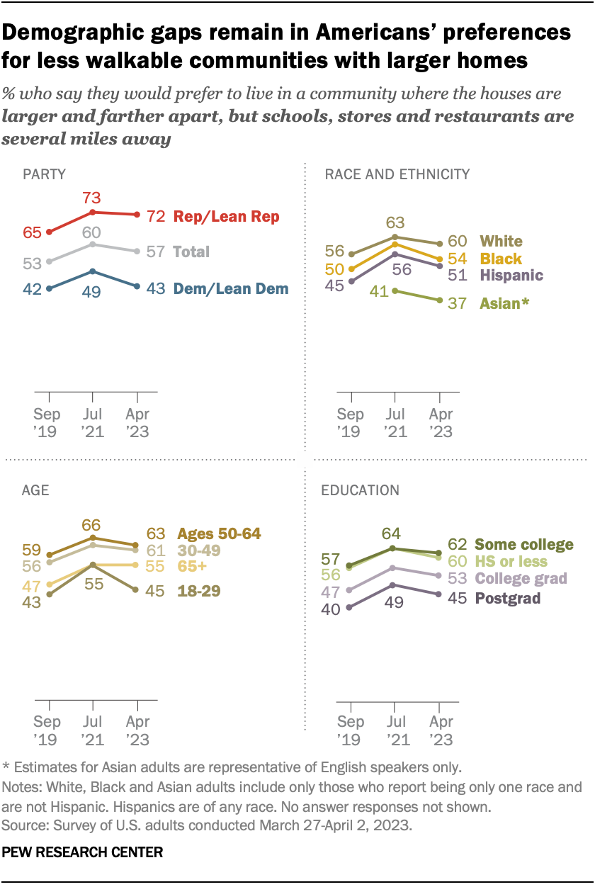 While a majority of adults ages 30 and older would prefer communities with larger homes over those with more walkability, adults under 30 are somewhat more likely to express the opposite preference. This reflects a modest shift from 2021, when 55% of 18- to 29-year-olds preferred communities with larger homes. That share has dropped 10 percentage points over the last two years."