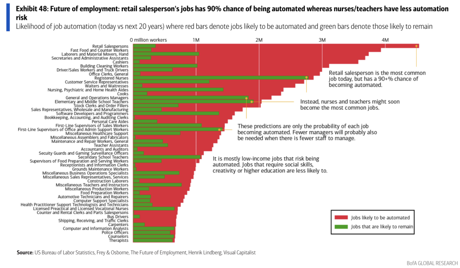 Have a look at the chart from Bank of America’s Haim Israel. Automation is inexorably driving huge numbers of jobs away. I suspect workers have figured for themselves they want to skip taking positions that will eventually be automated anyway. As we discussed back in July, the CARES Act monies flowed to people who recognized this — and so they learned new skills, got degrees online, trained themselves for new careers."