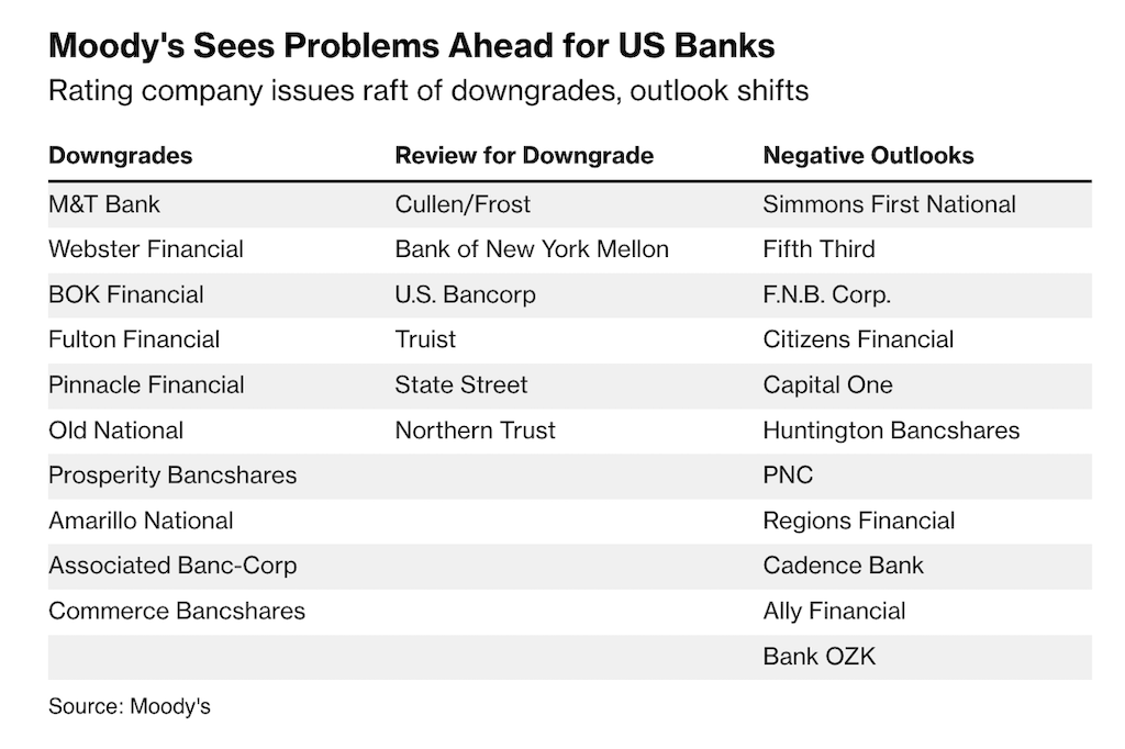 “Collectively, these three developments have lowered the credit profile of a number of US banks, though not all banks equally,” the rating company said." – Hari Govind and Steve Dickson, Bloomberg