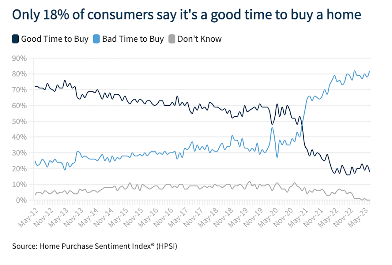 Homebuying sentiment once again matched its all-time low, with only 18% telling us that it's a good time to buy a home. Unsurprisingly, consumers continue to attribute the challenging conditions to high home prices and unfavorable mortgage rates. Further, the share of consumers expecting home prices to continue to rise has also been on a steady climb since March, which may only add to perceptions of unaffordability. Additionally, we have not seen much movement in the ‘good time to sell’ component over the last few months, an indication that the current low levels of existing homes for sale will likely continue to persist in the near term, as also reflected in our latest forecast.” Doug Duncan, chief economist, Fannie Mae