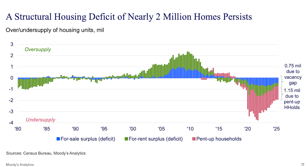 There is a structural housing deficit of nearly 2 million homes, deRitis's research shows, partially driven by a vacancy gap but also primarily by pent-up demand from young adults aged 25 to 35 who are currently living with family or roommates and can’t afford their own housing.