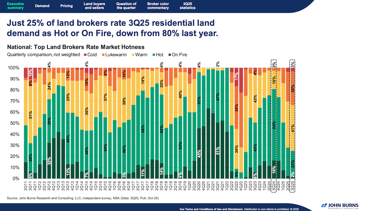 Jody Kahn, Senior VP of Research at John Burns Research & Consulting, and her team just wrapped up a couple of the most revealing, granular, real-time pulse-check surveys of homebuilding and residential land sentiment in the business: a mid-month poll of about 90 homebuilding firm executives, and the firm’s October 2025 Residential Land Survey, compiled from about 90 active broker and developer participants nationwide.