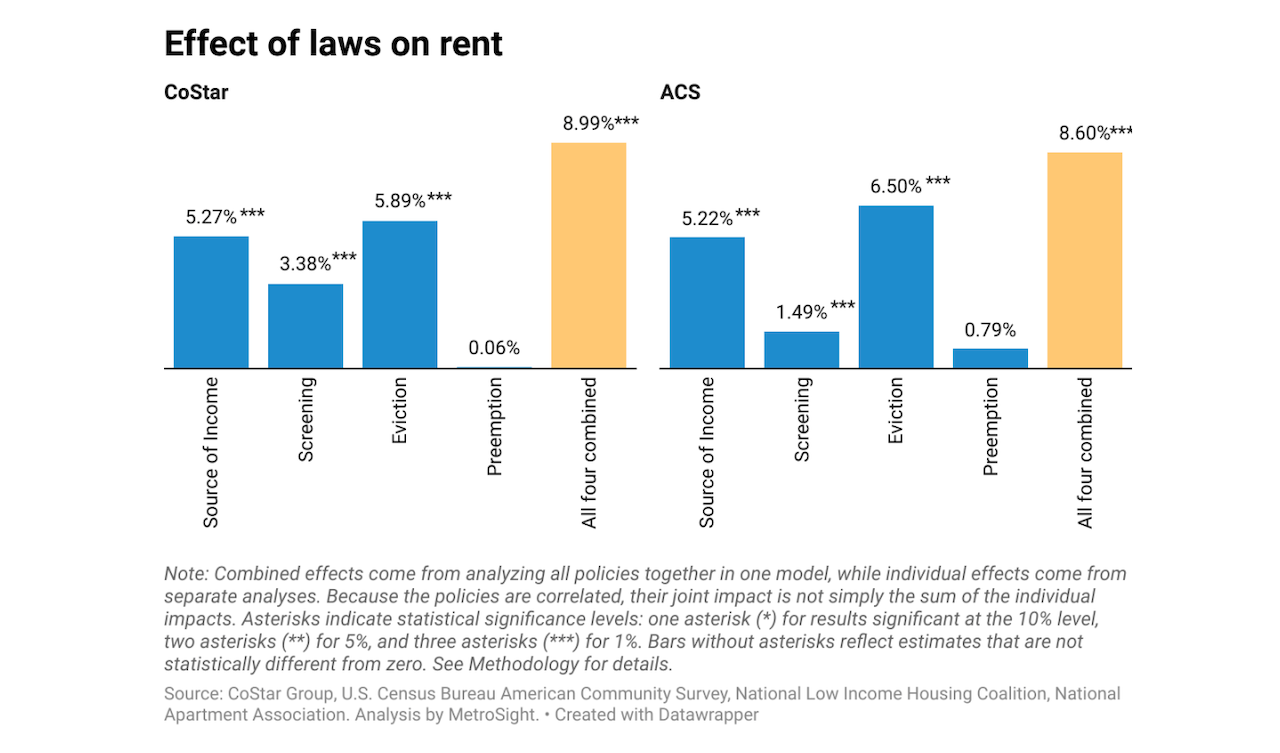 - Source-of-income laws (designed to support voucher holders) raised rents between 5.2% and 5.3%, an increase of about $876 to $1,104 per unit annually.