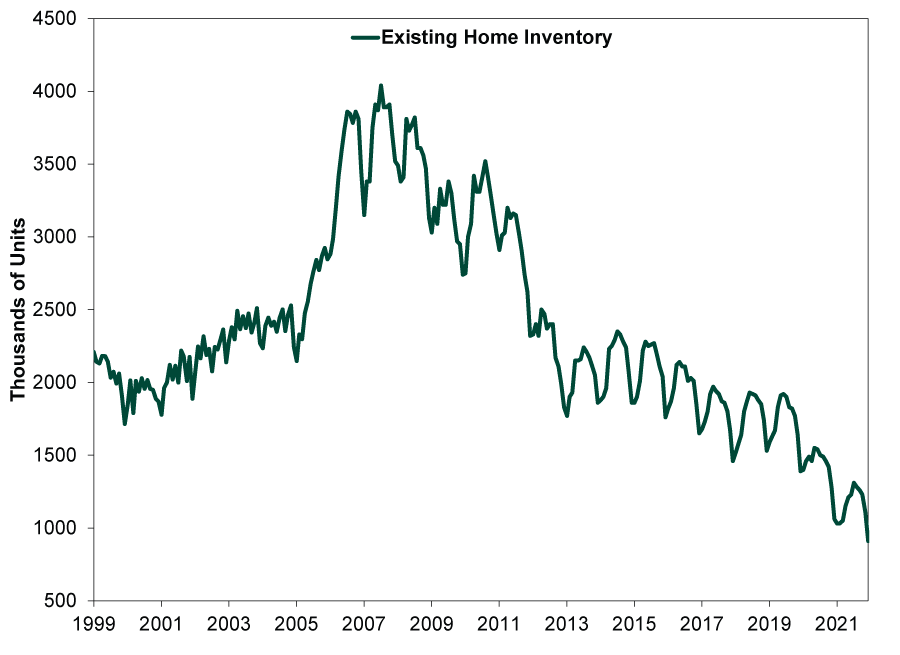 Lack of available homes for sale supports pricing, and it is no secret how we got here: Lockdowns halted construction, then resource shortages delayed efforts to reboot it. Hot markets where supply can normally grow easily to meet demand, like the greater Houston area, suddenly had an influx of new buyers bidding for a finite supply of existing homes. Construction couldn’t respond quickly enough. Contrast this with 2005 – 2006. Housing inventory rose from just over two million starting in 2005 to almost four million near 2006’s end.