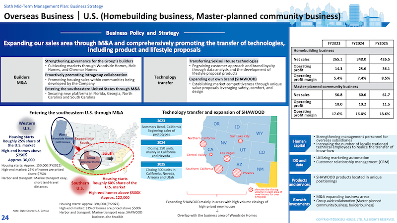 The plan, as Sekisui House has it mapped out, suggests it will continue to pursue M&A as it fills in its United States operating footprint, most likely adding a launch-pad strategic acquisition in the fast-growing Southeastern U.S. residential arenas.