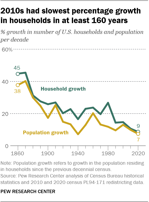 Growth in the number of U.S. households during the 2010s slowed to its lowest pace in history, according to a Pew Research Center analysis of newly released 2020 census data.