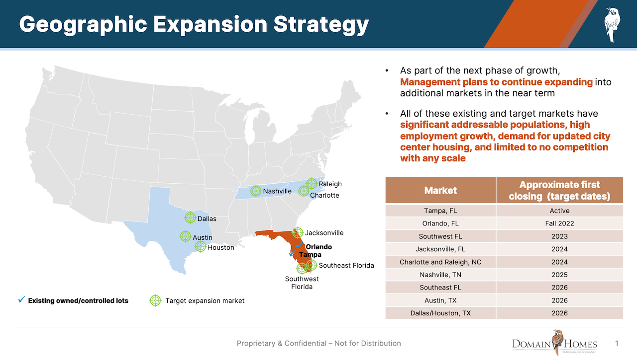 Having come of age "with a tennis racket in one hand and a hammer in the other," McSwain and her team at Tampa, FL-based Domain Homes now compete – for local customers, local trades, local access to lots, and a local, regional, national, and global pool of investment capital as a strategic "zag" when most everybody else is "zigging." Domain, on pace to close upwards of 200 homes in 2022, at more than $100 million in revenue, on a model that is 80% purchased scattered lots, and 20% build-on-your lot, is now looking for a capital boost to power expansion of its model to five new markets – Raleigh and Charlotte, NC, Nashville, TN, and Austin, Dallas, and Houston, TX.