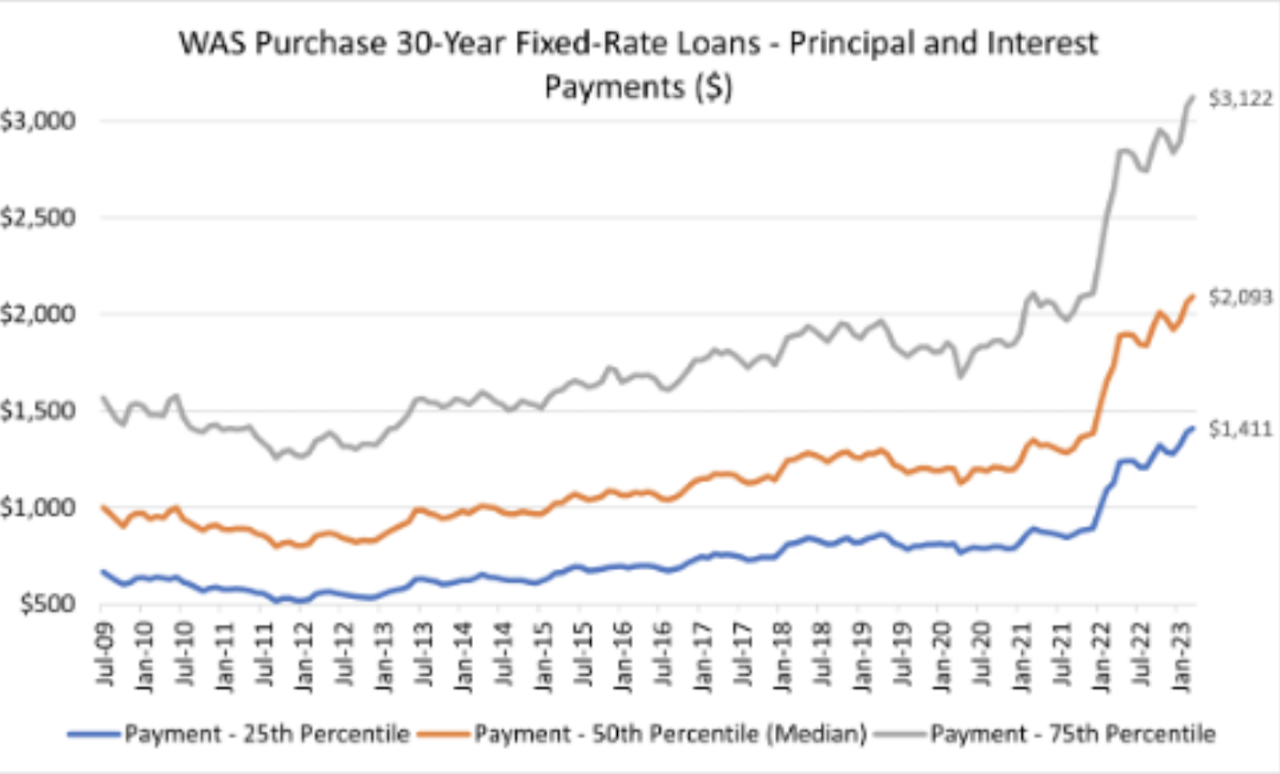 Homebuyer affordability declined in March, with the national median payment applied for by purchase applicants increasing 1.6 percent to $2,093 from $2,061 in February... The national median mortgage payment was $2,093 in March, up from $2,061 in February and from $1,964 in January. It is up $357 from one year ago, equal to a 20.6% increase."