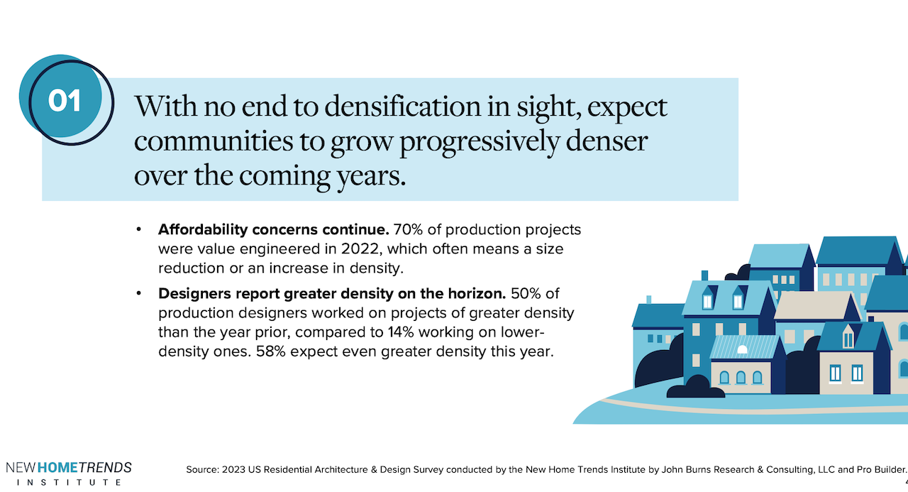 An April 2023 "Insights from the Drawing Boards" report on the Future of Production Home Design, from John Burns Real Estate Consulting's New Home Trends Institute contextualizes the standing challenge like this: