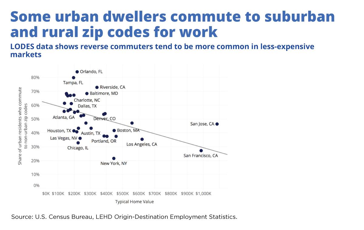 In 20 of the top 35 largest markets, over half of urban workers were reverse commuters.