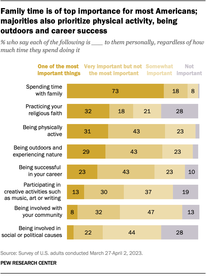About three-quarters of U.S. adults (73%) rate spending time with family as one of the most important things to them personally, regardless of how much time they actually devote to it. Nine-in-ten say they view it either as one of the most important things or as very important but not the most important thing. – Pew Research