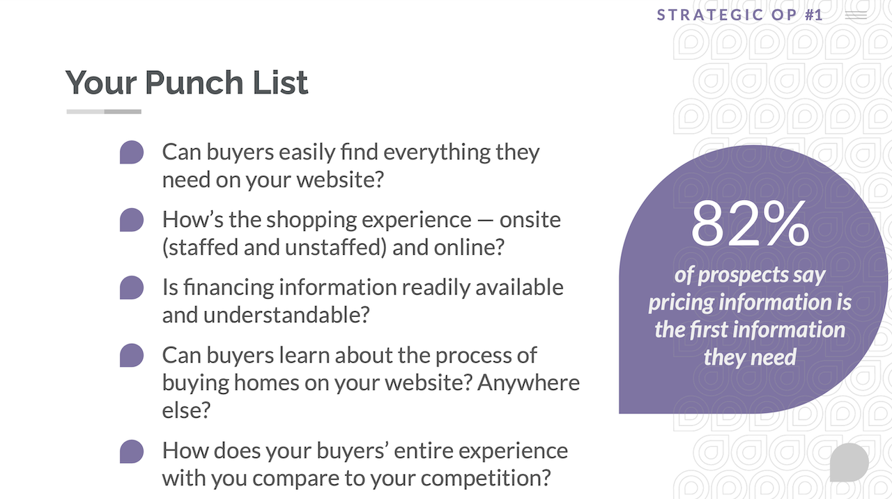 In terms of actions that we talked about, one is this shop like a homebuyer. Yes, do this secret shopping. This was a beginning of a punch list for the. I suggested that they sit with someone who's outside of the industry and have them walk through the website like they are shopping for a home. What are they doing, where are they going? Can they find it? How hard is it to get what they're looking for? Set aside for a minute what you know, as a builder, set aside for a minute what you know about your metrics, but get at a personal level and see what that looks like. 82% of the prospects said pricing information is the first thing they want. So people have to be able to find that. It needs to be transparent and needs to be consistent. Talked a little bit about the shopping experience on site. One, how is it when you walk in and encounter a person who's actually there? But often we don't have people in those sales offices right now. So what's that experience like? Can I find the model? Is there a QR code outside to help me get any other information or am I just like, Oh, 'whoops, I guess I'm out of luck and I guess I'll leave but I was gonna buy a house today.' You know what is that like? Are you missing opportunities because you're not creating the right experience, staffeed or unstaffed? And then also online, what's the whole thing look like from any digital advertising that's there to the website, and so on.
