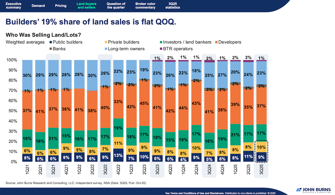 That doesn’t mean builders are sitting entirely idle. Some are actively unwinding or reshuffling lot positions they had previously secured, particularly deals that no longer pencil under today’s pricing and margin constraints. According to the land survey, builders (public and private) accounted for 19% of land and lot transactions in Q3, a steady share from Q2, but one that’s growing within a smaller overall volume of activity.