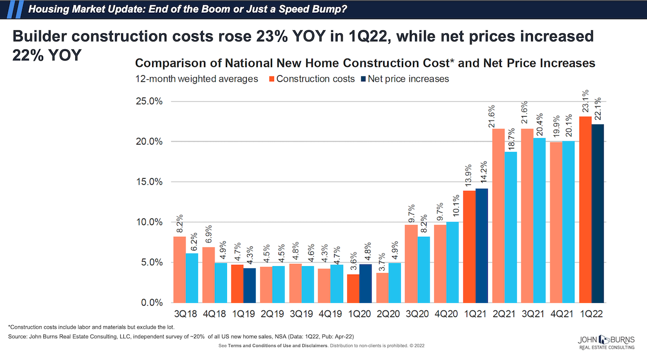 Going back to that high prices shocker earlier, there's only one set of figures more staggering and astonishing than 20% year on year price increases – actually median prices for new homes were up 21.4% y-o-y, March of 2021 vs. March '22 – and that's this: Builder's construction costs. Here's how that looks across a pre-pandemic through the present time frame, according to John Burns Real Estate Consulting: